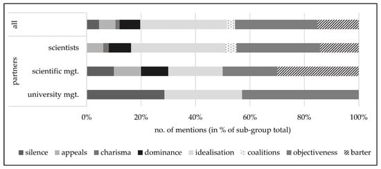 In addition, the science managers frequently expressed tactics that they would potentially use if certain preconditions could be created and which they linked with great potential for success. There are no clearly favored tactics here, but it is noticeable that dominance and objectivity are more important here than in the other determinants of success. This indicates a desire for more power based on rules vis-à-vis scientists, at least for some science managers.