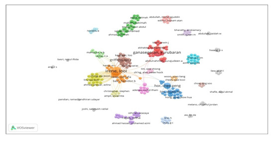 A total of 55 records were retrieved from the PubMed database between January 2009 and October 2019. These include original research papers, 42 (76.4%), reviews, 11 (20%) and case-reports, 2 (3.6%). Twelve papers (21.8%) were published in Malaysian journals, while the rest, 43 (78.2%), were works published in international journals. The top five journals with most published papers were The Medical Journal of Malaysia (10.9%), Medicina (Kaunas) (7.3%), Malaysian Orthopaedic Journal (5.5%), Plos One (3.6%) and Malaysian Journal of Medical Sciences (3.6%). With regards to co-authorship analysis, a total of 308 authors from 28 clusters were identified to publish the retrieved 55 records from the institution. The most productive authors from the institution were Irene Looi (14 papers), Kurubaran Ganasegeran (nine papers) and Hor Chee Peng (seven papers). Publication output of authors from the institution that linked to co-authors is exhibited in Figure 2.