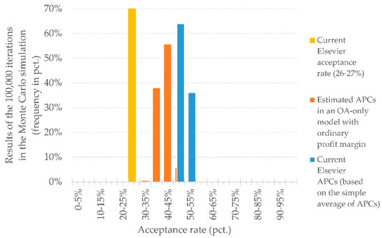 The third simulation stage relies on the direct relationship that, in an OA environment, ties the publisher’s revenue to quantity (number of published articles) and price (average unit APC). All else being equal, if APCs decrease, the revenue loss may be recovered by increasing the number of accepted articles, resulting in an unchanged profit if costs are constant. RELX Annual Reports state that “In the primary research market during 2017, 1.6m research papers were submitted to Elsevier … resulting in the publication of over 430,000 articles” [28] (p. 14) and “Elsevier serves the global scientific research community, publishing over 470,000 articles in 2018 … with 1.8m articles submitted” [29] (p. 14). Although the number of paywall articles analyzed here, based on ScienceDirect data, is several thousand higher (potentially because many conference papers are indexed as research articles), the above data imply an acceptance rate of about 26–27%. The analysis suggests that the rate could rise to about 35–45%, considering both the estimated ordinary APCs in an OA-only model (according to the second stage above) and current Elsevier APCs (according to the assumption of their triangular distribution). Furthermore, the optimal acceptance rate from the market perspective could be even higher and fall between 45–55% considering the simple average of current Elsevier APCs (Figure 3 and Figure 4).