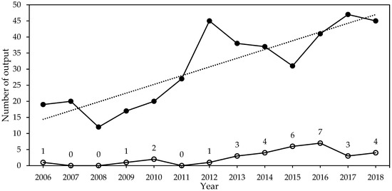 A total of 731 publications were retrieved following a Scopus search using the keywords “TITLE-ABS-KEY (gunshot AND residue) AND PUBYEAR < 2019”. The majority of the 731 outputs were research articles (606), 58 were conference papers and 31 were review articles. The other document types were: book chapters (16), notes (7), short surveys (4), letters (3), conference reviews (2), books (2) and errata (2). The earliest record returned in this search on Scopus was an article by Price published in 1965 [15]. The number of outputs has gradually grown over the years, and the number of publications per year for the period 2006–2018 is shown in Figure 1 with the values listed in Table 1. The Compound Annual Growth Rate (CAGR) for years 2006 and 2016 for research outputs within the GSR domain was 8.0% ((last number/first number)^(1/periods)-1), a growth significantly higher than the annual change of 3.9% reported by the National Science Board, Science and Engineering Indicators 2018 [16]. The Average Annual Growth Rate (AAGR) (2006–2018) within the GSR domain was 11.2% with a standard deviation of 29.6%, Figure 1 and Table 1, revealing a steady growth despite some variability between years.