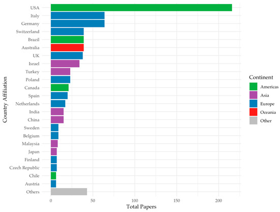 The country of origin of the 731 outputs was extracted from the authors’ affiliations, and the results are shown in Figure 2. The United States of America had the largest paper count, followed by Brazil and Italy. For documents with authors from more than one country, each country was counted individually. The analysis does not provide a count related to the number of authors, but this option is available in the R code developed for this work [14].
