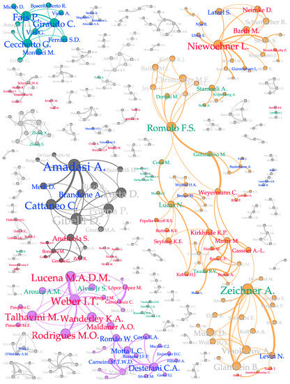 Co-authorship network generated by Gephi and ForceAtlas2 algorithm. Authors who have contributed to more than one publication on gunshot residue were considered, selected using the R code. The nodes represent authors and the edges co-authorship. Eigenvector centrality is used to determine the size of the node. The four largest networks (i.e., group of authors) are in colour. The width of the edge is proportional to the number of contributions between the two authors. The name of the authors who have their last publication in 2016 or later are colour-coded: 2016 in blue, 2017 in green and 2018 in red.