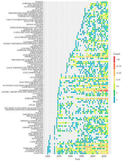 Bibliometrics is a statistical and quantitative method used to analyse publications and visualise networks associated with a body of literature (e.g., [8,9]). Such an approach is being employed in systematic reviews and can potentially reveal unknown relations between different areas of research, and such findings have been demonstrated in literature-based discovery (e.g., [10,11,12]) or the study of citation impact indicator (e.g., [13]). In this work, a simplified scientometric approach (a subfield of bibliometrics with a focus on analysing the scientific literature) has been applied to the available literature on gunshot residue (GSR) to identify patterns and trends in, for example, keyword, co-authorship, collaborative networks, country of origin and citations rates.