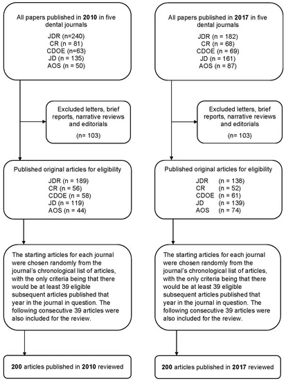 A total of 400 articles that were published in 2010 and in 2017 were analyzed and covered five dental journals: Journal of Dental Research (JDR), Caries Research (CR), Community Dentistry and Oral Epidemiology (CDOE), Journal of Dentistry (JD), and Acta Odontologica Scandinavica (AOS). We chose these dental journals to validate inferences about the wide range of statistical reporting in visible and established dental journals. JDR has constantly been a highly visible and cited journal in dentistry with a Clarivate Analytics (previously by Thomson Reuters) impact factor (IF) of 3.773 in 2010 and 5.383 in 2017; CR had the highest impact factor of the cariological journals in 2010 (IF 2.920), but the journal’s visibility decreased in 2017 (IF 2.188); JD is an example of a journal that increased its visibility during the evaluation period (IF increased from 2.115 to 3.770); CDOE takes the epidemiological approach to dentistry and it had a slightly decrease visibility (IF was 2.328 in 2010 and 1.992 in 2017); and, AOS is a European journal with an emphasis on the use of preventive methods in dentistry with an IF of 1.017 in 2010 and 1.522 in 2017. Medline, Web of Science, and Scopus indexed all of the selected journals, which are the three most comprehensive indices of medical scientific journal articles.