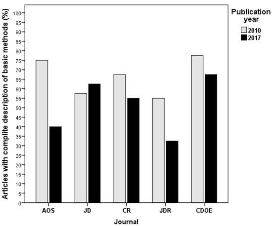 Percentage of articles with complete description of statistical procedures in dental articles published in 2010 (n = 200) and 2017 (n = 200) by the journals. AOS = Acta Odontologica Scandinavica, JD = Journal of Dentistry, CR = Caries Research, JDR = Journal of Dental Research and CDOE = Community Dentistry and Oral Epidemiology.