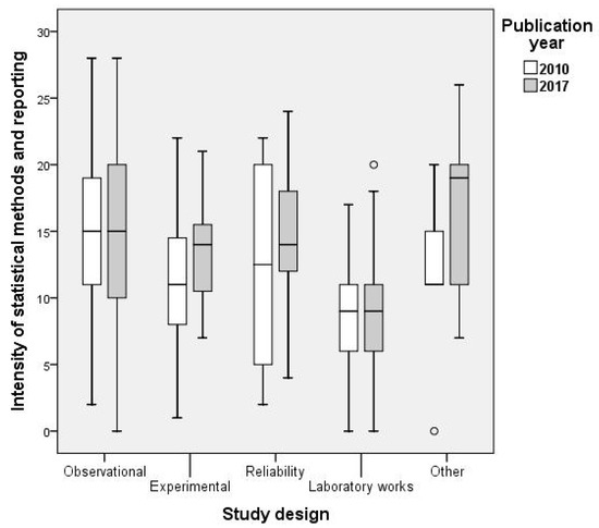 Box plot graph of the statistical intensity in dental articles published in 2010 (n = 200) and 2017 (n = 200) subdivided by the study designs.