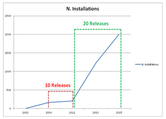 Within the first decade after DSpace was published in 2002 there have been no more than 10 releases and, as mentioned above, around 350 installations worldwide. As shown in Figure 1, the following years saw a significant increase in releases, with 20 of them being published between 2011 and 2014 alone. With the rising number of releases, the number of DSpace installations also started to increase.
