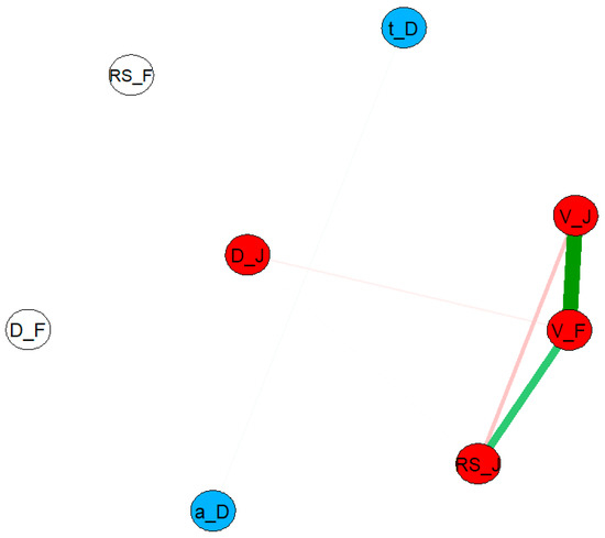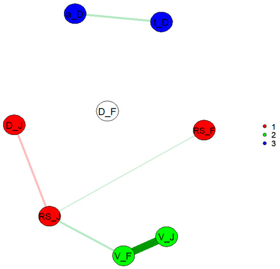 Exploratory graph analysis of the openness and idea density indicators for the creativity dataset. V_J = variety based on journals; D_J = disparity based on journals; RS_J = Rao-Stirling based on journals; V_F = variety based on first authors; D_F = disparity based on first authors; RS_F = Rao-Stirling based on first authors; a_D = idea density based on abstracts; t_D = idea density based on titles.