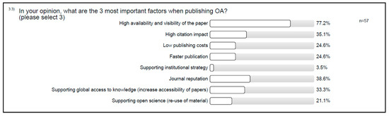 The users pointed out that their 3 most important reasons for publishing OA are that it allows for a high availability and visibility for the paper (77.2%), because of the journal’s reputation (38.6%), and due to high citation impact (35.1%), closely followed by the importance of global access to knowledge (33.3%) (see Figure 2).