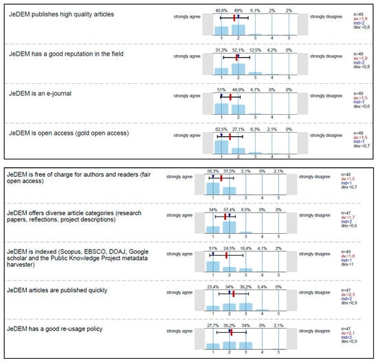 The results from the registered users show that the majority agree or strongly agree (89.8%) that JeDEM publishes high-quality articles, and 84.4% believe that JeDEM has a good reputation. For most (95.9%), the factor that JeDEM is an e-journal plays an important role for their publication choice, and for 89.6%, the idea that JeDEM is an open access journal is a reason to publish in it (Figure 3). Electronic publishing, high quality, open access, and reputation thus all play very important roles for publishing in JeDEM, although for our user group, the e-factor and quality are slightly more important based on this first user survey.