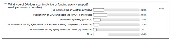 A majority of users pointed out that they had no institutional support for OA (31.6%). Overall, 22.8% selected that their institution had an OA strategy and/or their institution supported publication in gold and fair OA journals (29.8%), where fair is understood in terms of the Fair Open Access Alliance (FAIR [74]) as shown in Figure 4.
