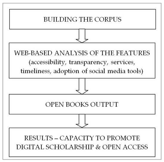 Our approach was an exploratory study, using quantitative methods. Romanian authorities (governmental bodies, accrediting institutions, funding organizations, etc.) did not collect, until 2020 at least, data concerning our topic of interest, thus we had to extract the primary data. A primary source is a source from which we collect first-hand information, or raw data, on a topic. We aimed to identify information concerning the existence of university presses and their output in terms of open books only. Currently, there is no official list of university presses in Romania, therefore the first step toward identifying the existence and features of these institutions was to mine the existing databases. To create the corpus for investigation, we manually searched the homepages of the accredited public universities, extracted the information and crosschecked the information with the presence of the university presses parented by public universities in the digital world. We designed a data collection form to systematically identify the features pertaining to university presses in the 21st century, such as accessibility, provided editorial services, timeliness (last update) and adoption of social media tools to promote the press and/or the books (Appendix A). Finally, we analyzed the open book availability, with a focus on the year 2020, corresponding to the outbreak of the COVID-19 crisis. The last consultation of the university presses’ websites was carried out from 1 to 7 September 2020. The research design is presented in Figure 1.