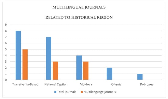 From a historical point of view, Romanian regions had different linguistic traditions: the national capital, the region around it, and Moldova had a strong French affiliation, while in Transylvania–Banat, a multicultural and multilingual type of communication was in use. It was interesting to test whether the tradition survived in the 21st century, with English as a first medium of choice for scientific publishing. Finally, we refined the data and focused on the journals that are committed to further knowledge in communication sciences only, since the initial pool showed that many SSH journals try to embrace a “catch-all” model and use the term in a rather loose meaning, not necessarily covering content pertaining to communication sciences. The confusions are easy to understand. Although communication sciences have been taught in Romania since 1991 [], it was only in 2004 that they were included as a distinctive branch of social sciences in the Romanian institutions dealing with the evaluation of research output. Also, since in the 1990s some faculties of letters started communication sciences/journalism programs, communication sciences are often associated with philology, education sciences, cultural studies, arts, and so forth [].