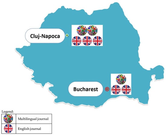 The order of the journals is the same as in Table 1. English dominates the scene for communicating with potential authors, all journals using it for spreading the word about publication opportunities. In the digital age, the actual location of a journal diminished in importance, by comparison to print-only times, a fact that revolutionized the world of publishing, but also helped level the ground for English [,,]. The typical recruitment pool of authors is the academic community supporting the journal. However, quality criteria require that only a portion of the publishing space be given to the in-house researchers and efforts need to be made to attract researchers from other institutions, preferably from abroad []. It naturally follows that a language understood by all should be available for informing authors. Five out of the total number of journals use the national language, Romanian, too, either as a first, or as a second choice. Three webpages maintain the francophone tradition of Romanian science and have a French variant too. A particular case is that of Hungarian: the journal displaying this language is rooted in a multicultural university, where Hungarian-led scholarship has a tradition of several centuries. With the help of various Hungarian donors, the journal appears (online and in print) with Hungarian dominating the publication space, offering also support for Hungarian language teaching in communication sciences (journalism). Occasionally, however, the journal publishes texts in English and Romanian (less frequent), a situation for which abstracts are required in English and Romanian. The parameter “publication languages” shows a diminishing interest for Romanian, with only three journals still using it for article presentation, and three journals requiring an abstract in Romanian either with the article, or as an additional language for abstracts. French language articles are hosted by seven journals, while German is used in four journals and, surprisingly for the Romanian scientific tradition, Spanish appears as a possible language of publication in two journals, in a systematic way. One journal lists only the above-mentioned major languages as possibilities but publishes also in Italian. The linguistic choices are not debated/argued for or against, as if the issue is invisible [], with one notable exception: Ekphrasis, serving as a venue for research in film and cultural studies. The editors make a point of specifying that the articles published in the journal should use English and other European languages to maintain multiculturalism and interdisciplinarity, commenting that “we encourage authors to use English as contemporary lingua franca of research while considering multilingual expression a European trait. All articles must have exclusively English-language abstracts, key words, and affiliation of the author”. At this point of research, with eight cities hosting all the 22 journals, a finer-grained analysis is required.