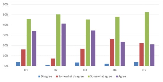 The types of questions were based on the psychometric Likert scale, which is often used in similar surveys, for the evaluation of population attitude or opinion. Participants could choose from 4 scales instead of 5, in an attempt to achieve more concrete results by preventing them from taking the easy way of neutrality. Similar surveys [55,56] inspired the content of the questionnaire.