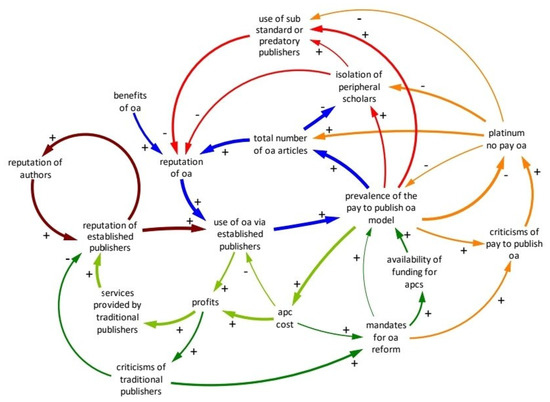 Dudley’s closed loop diagram describing the current (early 2021) situation in the scientific publishing system. Arrows (causal links), indicate how a change in the causal variable affects change in the second variable. Change in the same direction is indicated with a plus sign. Change in the opposite direction is indicated with a minus sign. (Reproduced from [42], Creative Commons CC BY 4.0 license).