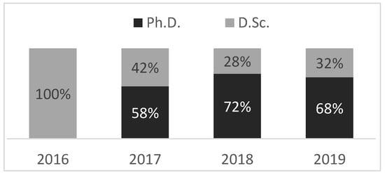 It is important to note that, between 2011 and 2017, Uzbekistan practiced a single-stage habilitation policy according to which any graduate-level degree holders (B.Sc., M.Sc., and Ph.D.) could equally pursue a doctoral degree program and be awarded the highest D.Sc. degree. From 2017, however, a D.Sc. is awarded for a portfolio of work later in an academic’s career, that is, after a Ph.D. Figure 2 illustrates the percent of academics who obtained a D.Sc. compared to a Ph.D. between 2016 and 2019. The number of D.Sc. degrees progressively decreased from 100% to 32% over the last four years.
