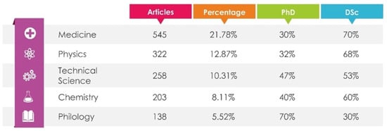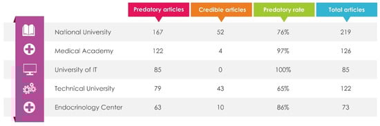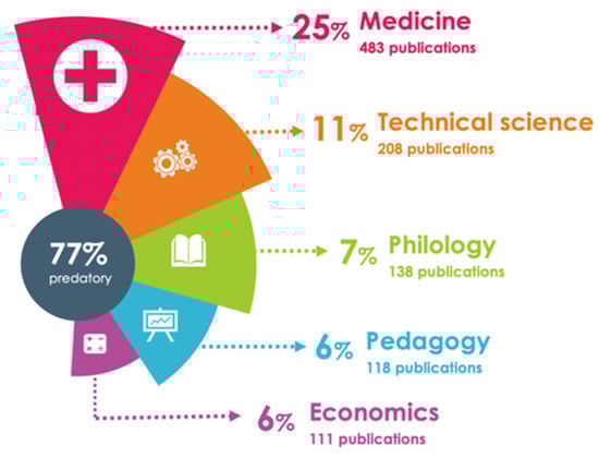 Those in the medical field fall prey to predatory journals because obtaining Ph.D. and D.Sc. degrees in medicine is necessary for promotion to higher positions and degrees and, correspondingly, a requirement for increasing their wages. The next four subjects in which researchers are more likely to submit their papers to predatory publishers are technical sciences, philology, pedagogy, and economics. The main reasons behind this trend are (i) the lack of dedicated research institutions in those fields—the articles are published by university lecturers for the sake of publication but not as a result of conducting original research; (ii) reputation pressure to publish in international journals, especially by universities, where the payoff for real research is minimal, which further stimulates predatory publishing; (iii) the lack of thematic research funding agencies or departments within the organization with research support tools and resources; and (iv) a lack of competence for distinguishing credible publications from predatory publications.