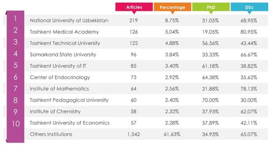 As Abdurakhmanov [] wrote: “For the first time in the world, stable superconducting materials with increased transition temperature to the superconducting state up to 110–150 degrees Kelvin have been obtained with the help of concentrated solar energy”. In chemistry, Uzbek scientists developed a new research field—adsorption-energy stoichiometry—with new concepts, theories, and semiempirical results published in an article by Springer []. Uzbekistan led the way on this subject because several scientific research institutes and centers in Uzbekistan focus on the relevant fields, such as the Institute of Nuclear Physics and the Institute of the Chemistry of Plant Substances; however, this is not the case for all academic disciplines.