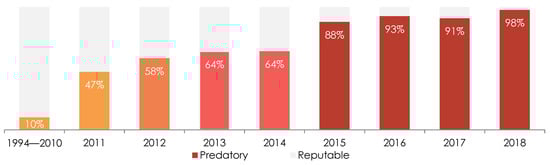 Hence, we introduce a dummy variable for the periods, which is 1 if publications date from 1996 to 2010 and 0 otherwise, to test this hypothesis. The choice of the time period is justified because, between 2008 and 2010, the financial model of the publishing industry shifted from readers to authors; therefore, a priori, it is expected that the predatory rate is higher for the periods after 2010.