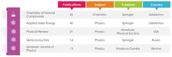 Figure 7 below presents the top-five reputable journals in which Uzbek scholars have published their articles. Interestingly, Springer—a reputable global publishing company—issues two online journals from Uzbekistan: Chemistry of Natural Compounds (CNC) and Applied Solar Energy (ASE).