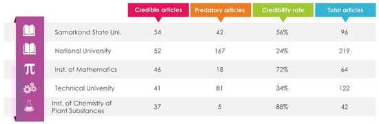 Samarkand State University, with a total of 54 publications, comes first, with most articles being published in the field of physics (47%), philology (18%), chemistry (9%), and astronomy (8%). The National University of Uzbekistan, which ranks first in terms of the number of articles published in predatory journals, comes next, whose academics published 52 articles in internationally reputable journals. Similarly, Technical University, the fourth-highest-ranked university based on the number of predatory publications, is in the fourth place based on credible publications. The Institute of Mathematics and the Institute of Chemistry of Plant Substances are also included in the top-five list. Despite publishing fewer articles cumulatively, the quality of the journals in which their researchers publish is high, at 72% and 88%, respectively.