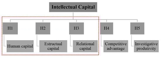 Scientific production is the direct result of research activity, from which products such as research articles, books, book chapters, patents, utility models and technological products, architecture, and design, among others, are derived [,]. Through the literature review on intellectual capital, the following hypotheses (H) were established, taking into account Figure 1: