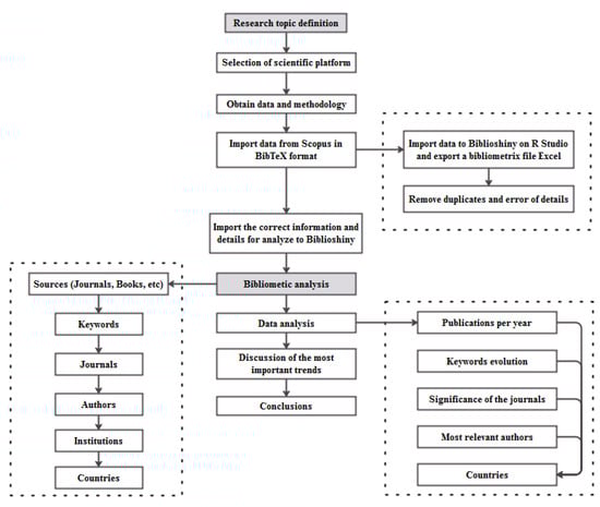 The Bibliometric analysis was carried out using the Bibliometrix library and BiblioShiny platform of the RStudio® software []. Besides, the VOSviewer software was used to obtain the relationship between countries and keywords. Figure 2 shows the principal steps of the workflow applied to the data analysis obtained from the Scopus database.