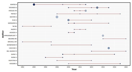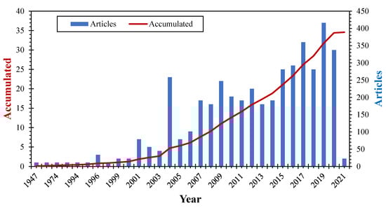 Table 2 shows the general results that were analyzed in the R studio software. Considering the methodology of Figure 2, a publication time from 1947 to 2021 was observed with an annual growth rate: 2.34%. Additionally, the types of documents, the authors, and the collaboration between authors for the period of time were studied.