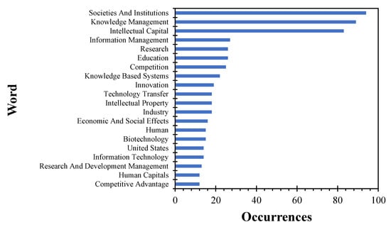 Keywords were analyzed directly from the published documents, taking into account the frequency of appearance of the most used keywords, as shown in Figure 4. In this way, it was evident that the three most used keywords were “societies and institutions”, “knowledge management”, and “intellectual capital” with an average frequency of 80 times, which is of interest considering the analysis of this topic for higher education institutions, which involves different topics of knowledge.