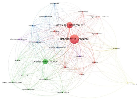 Figure 5 shows the co-occurrence between the keywords. Five clusters of keywords can be observed, the most important being in the central point, intellectual capital, followed by knowledge management (red color), societies and institutions (color green), and, to a lesser extent, a cluster related to competition and education and universities, (colors: purple, blue, and yellow, respectively). This figure determines the importance of the thematic areas or topics related to the analyzed documents and thus relates to the concept of intellectual capital.
