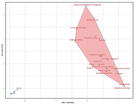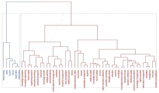 Figure 6 shows two specific dendrograms for the keywords, which relate areas on human resources and organizations (blue lines) and everything related to intellectual capital and knowledge management (red lines).