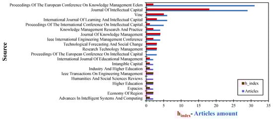 Figure 8 shows the most important journals in which articles on the subject of intellectual capital have been published. Note that the “Journal of Intellectual Capital” is the most relevant journal because it has an h-index of 18 with an impact factor of 1.18 being its quartile Q1. Subsequently, it is followed by the journal of the “Proceedings of the European Conference on Knowledge Management” with a lower impact factor but with the highest number of publications on this topic studied in the Bibliometric analysis.