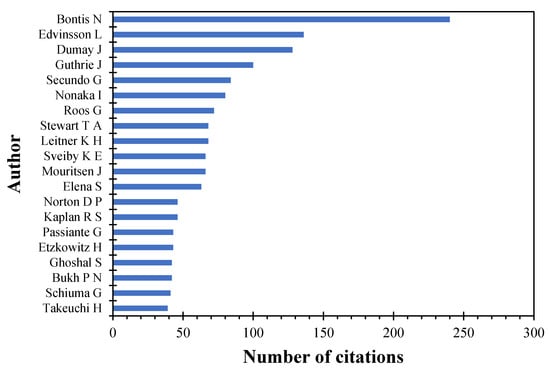 In the collection of documents, there are 369 authors, where 30.1% (111) had only one publication. However, Figure 10 shows the top 20 authors in the intellectual capital topic. Bontis, Edwinsson, and Dumay presented the highest citations on the subject, with around 240, 136, and 128, respectively, for the period of time analyzed.