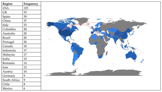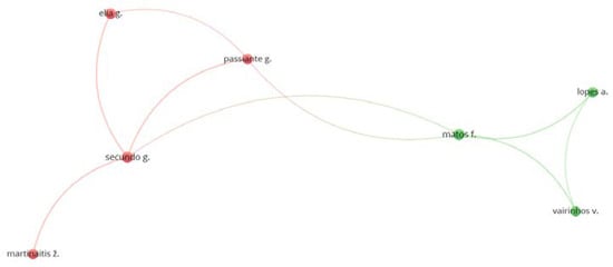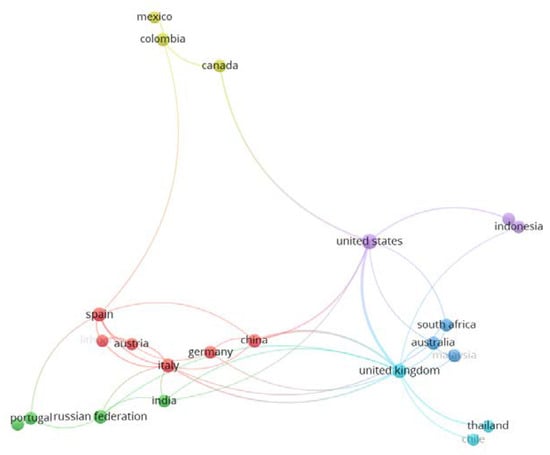 Figure 16 shows the collaboration networks between countries, where six collaboration networks were observed (yellow, red, purple, blue, light blue, and green), the most important being the USA, the UK, Spain, and Italy. This shows that the subject of intellectual capital has been studied by relevant countries, which reveals the importance of analyzing the aspects that this subject involves in institutions and universities worldwide. In the case of Colombia, collaboration networks are presented mainly with Mexico, Canada, and Spain, where the most important publications related to IC have been generated.
