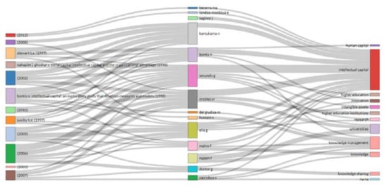 Passaro et al. [] investigated the impact of higher education on the emergence of entrepreneurial intention and human capital in students and academics, concluding that there are significant differences between the two samples concerning the level and the specific characteristics of entrepreneurial education that are the key factors for the development of business intent and human capital. Di and Corsi [] analyzed the contribution of intellectual capital to the development of the third mission in 71 Italian universities financed by the government in the period 2004–2014, concluding that there is a significant revelation of IC in the quality assessment model; in the same way, it was identified that the activities of the third mission have a positive impact on the university ecosystem, with a relevant performance of structural capital and relational capital in the development of the third mission. Veltri and Puntillo [] analyzed whether the performance management systems (PMS) of the universities consider IC management as a criterion to evaluate their managers, a case study from the Universidad de Calabria, which is far from considering IC substantially as a key criterion to evaluate your managers.