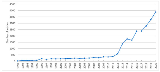 In this section, we report and discuss the results of our descriptive analysis (Step 2 in Table 1). Figure 1 shows the pattern of published articles from Kazakhstan during 1991–2020. Overall, the trend in the publications was unnoticeable in the first half of the 1990s. During 1996–2010, the research output was about 237.5 articles per year with no apparent changes in the number of publications. However, we can see a stable increase since 2011, with a rate of about 32.0 percent per year. Such an increase is the result of the implementation of a number of essential policies and laws in the HES sector. These include the State Program of Educational Development (2011–2020), the Law on Science (2011), the Law on Commercialization (2015), and the State Program for Education and Science Development (2016–2019). For example, the Law on Science was enacted to reevaluate new scientific directions, improve publication quality, and set standards for awarding academic degrees and titles [35,36]. Additionally, the State Programs (2011–2020, 2016–2019) set key targets relevant to the country’s research performance and contributed to its productivity. Some critical targets are the increase in the number of the local HES institutions in the global Quacquarelli Symonds (Q.S.) World University ranking (2 institutions were in the 2015 ranking, 10 in the 2020 ranking); the percentage of academic staff who publish in non-zero impact factor journals (the target of 3.25% for 2015 was achieved in advance in 2013); and the percent of academic staff who engage in research (8% was in 2011, 27% in 2014) [37]. Other requirements established in 2012 include publishing at least one paper in a journal with the two-year journal impact factor being above zero or indexed in Scopus (to award a Ph.D. degree) and publishing at least two and three articles in journals with a journal impact factor of above zero (to award associate professor and professor titles, respectively) [35]. Additionally, the grant funding scheme by the Ministry of Education and Science started considering the quantity and quality of the applicant’s publications in international journals indexed in the Web of Science or Scopus databases. Based on such policies that promote an increase in the quantity and quality of publications from the local researchers, we can expect that the growth of articles in international journals will continue in the near future.
