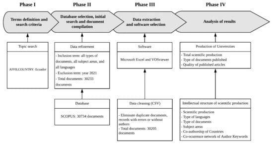 This study shows a systematic process made up of four phases that allow the analysis of the scientific production of Ecuador (see Figure 1): (i) terms definition and search criteria; (ii) database selection, initial search, and document compilation; (iii) data extraction and software selection, and finally, (iv) analysis of results.