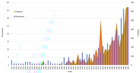 It is necessary to consider that at this stage (1920–1990), the Ecuadorian university was focused on teaching existing knowledge rather than its creation; due to a poor legal framework and late government budget allocation for research and development [,]. The scientific production of this stage can be observed in greater detail in Figure 2.