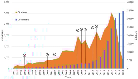 In Ecuador, scientific research is reflected in 30,205 documents and 344,183 citations, distributed over 100 years of research (1920–2020). For analysis purposes, it was divided into two stages. The first covers the first investigations in a range of 70 years (1920–1990). The second comprises the most significant production of documents and citations that the country generated during the following 30 years (1991–2020):