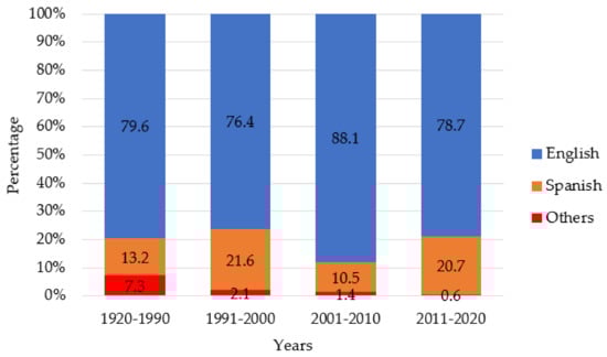 This prominence of languages needs to be examined as a function of time. Figure 4 shows the first stage of development (1920–1990) and the second stage (1991–2020), the latter divided into decades. The English language shows its majority presence in all periods (over 76%), with a peak of publications in the 2000s. The Spanish language lost prominence in this same decade, resuming with force (the 2010s) due to an unusual increase in Spanish-speaking journals (e.g., Risti Revista Iberica de Sistemas e Tecnologias de Informacao; Espacios; Investigación Clínica Venezuela; Archivos Venezolanos de Farmacología y Terapéutica; Revista Ecuatoriana de Neurología; Revista Bionatura, among others).