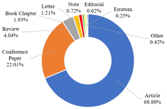 Scientific production has been reflected in 11 document types (see Figure 5). Journal articles are the majority (68.8%) because these are documents considered certified knowledge when examined by peer review and significant for the scientific community [,]. The conference articles are also representative (22.01%). However, the country entered this type of publication in 1989 [], and its significant growth began in 2013.