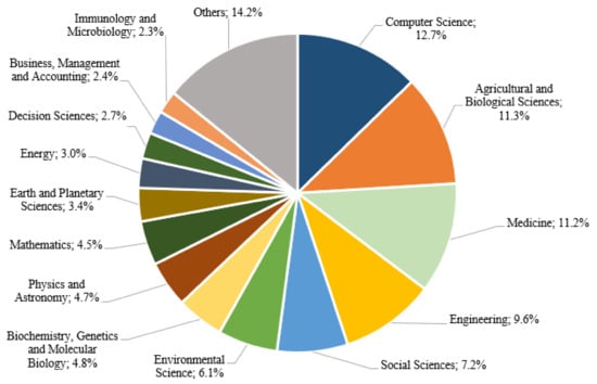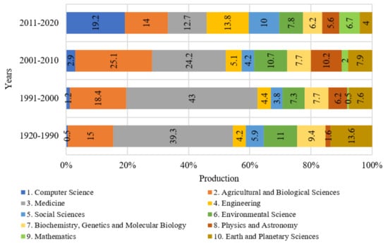 - Other subject areas in the 2011–2020 decade present a contribution of less than 10% of the total scientific production (see Figure 7). These areas correspond to Environmental Science; Biochemistry, Genetics and Molecular Biology; Physics and Astronomy; Mathematics; and Earth and Planetary Sciences.