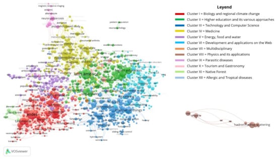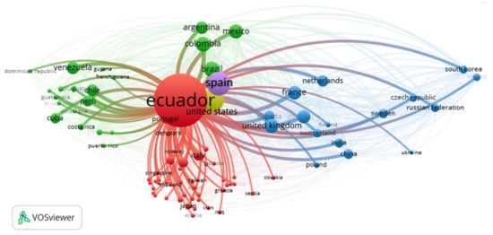 The green cluster is the closest group to the central cluster, that is, shows the contributions with most Latin American countries, distinguishing those that present a high relationship, such as Brazil (2166), Colombia (2012), Mexico (1855), Argentina (1425), and Venezuela (1386). The nodes that make up the red cluster show less collaboration from other European, Asian, and African countries, which can be observed in the size of their nodes and links.