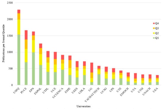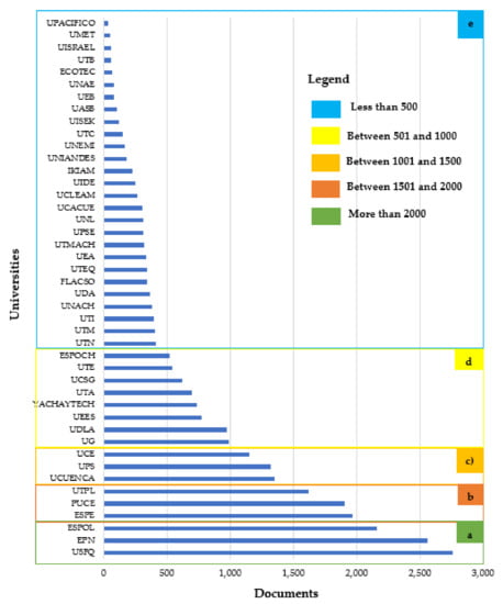 The second analysis emphasizes an essential agent in scientific production, which is the university. This section examines its production, published documents type and journal articles quality. Some of these analysis combinations are essential when generating a bibliometric study [,,].