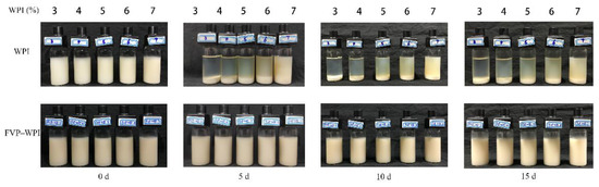 Images of the WPI and FVP–WPI solutions stored from 0 to 15 d at 4 °C are presented in Figure 2. When the pH was adjusted to 4.5, precipitates were observed at the bottom of the cells for the WPI solutions at all assayed concentrations. The supernatant became more and more turbid with the increase of WPI concentrations. However, the solutions of FVP–WPI complex displayed better dispersal than the WPI solutions. No phase separation occurred in the FVP–WPI solutions after being stored for 15 d.