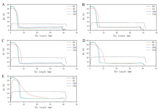 Back scattering (BS) of WPI solutions over storage time under static conditions. (A) 3% WPI solution; (B) 4% WPI solution; (C) 5% WPI solution; (D) 6% WPI solution; (E) 7% WPI solution.