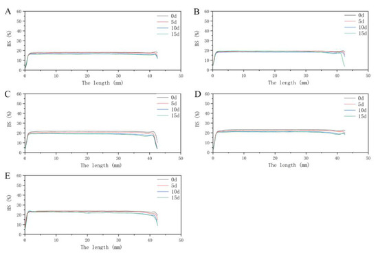 Back scattering (BS) of FVP–WPI solutions over storage time under static conditions. (A) 0.4% FVP–3% WPI solution; (B) 0.4% FVP–4% WPI solution; (C) 0.4% FVP–5% WPI solution; (D) 0.4% FVP–6% WPI solution; (E) 0.4% FVP–7% WPI solution.