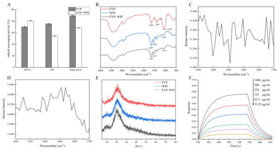 Antioxidant activities and structures of FVPs, WPI, and FVP–WPI. (A) The antioxidant activities of FVPs and FVP–WPI, (B) the FTIR spectra of the FVPs, WPI, and FVP–WPI complex, (C,D) the amide Ι bands of WPI and FVP–WPI in Raman spectra, (E) the XRD spectra of the WPI, FVPs, and FVP–WPI, (F) the fitting curves for association and dissociation of FVPs and WPI.