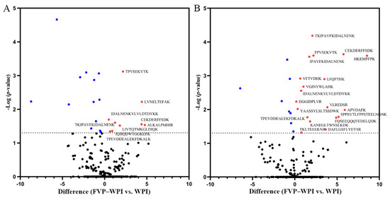 The volcano plots of the change in peptide abundance between FVP–WPI and WPI (control). (A) Differences of peptides digested for 10 min. (B) Differences of peptides digested for 120 min. Significant changes (p-value < 0.05) appear in the upper left (significant decrease) and upper right quadrants (significant increase) of the plot. The color is used to distinguish whether the sequences are different. Red circles represent significant increase and blue circles represent significant decrease.